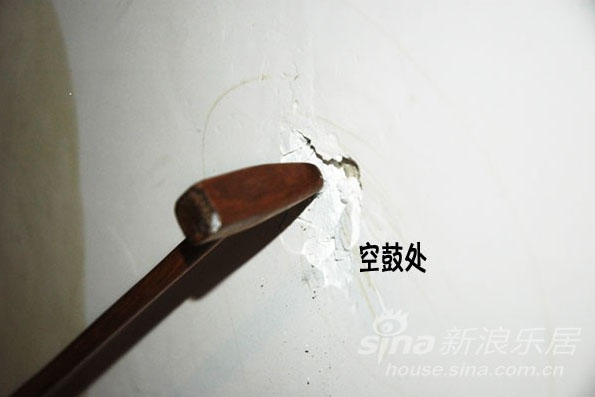 2. 2、检查墙面是否有空鼓,用小木锤或其他东西敲墙,敲到空鼓时发出的声音不实,很容易就可以听出来。做上记号,装修时用腻子填平。
