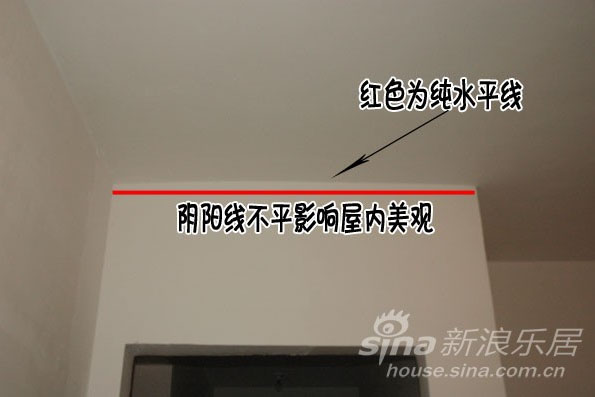 2. 2、检查屋顶和墙面的阴阳角线是否是水平线,如果不是,在今后装修中要先用粉刷石膏找低再用耐水腻子找平即可。